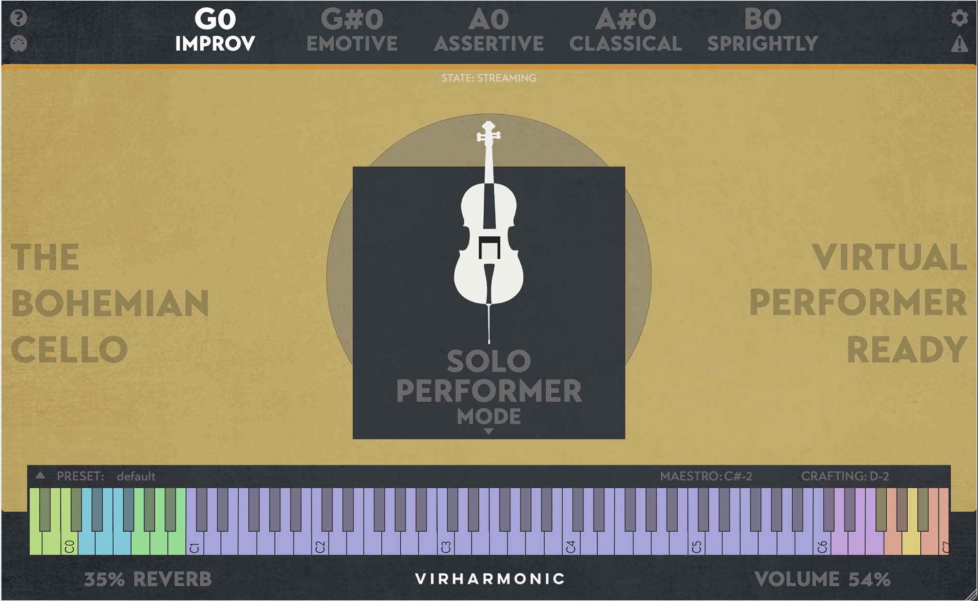 mood selection: improv, emotive, assertive, classical and sprightly, allowing you to change the behaviour of the cellist on the fly