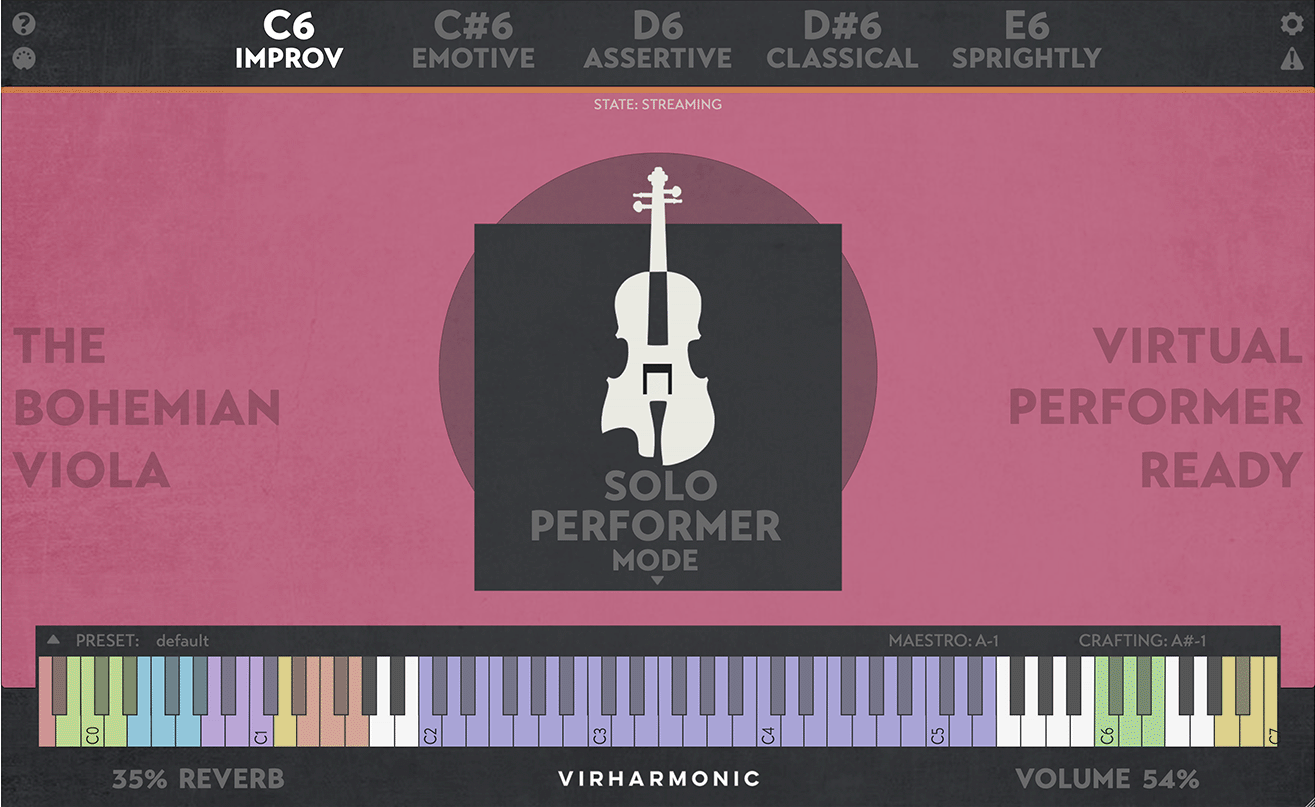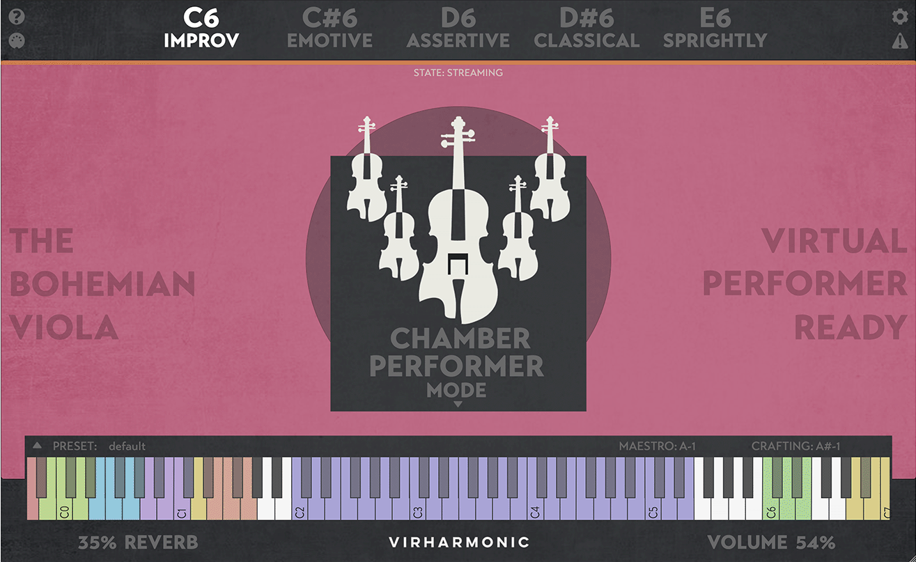 mood selection: improv, emotive, assertive, classical and sprightly, allowing you to change the behaviour of the violist on the fly
